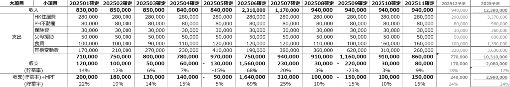 • 収入は約94万円、支出は約91万円、単純収支は約8万円(貯蓄率9%)、MPFを含めると約15万円(貯蓄率15%)。