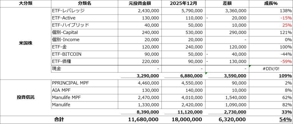 24年12月から25年12月までの一年間の変動となりますが、株式は430万円→688万円と+253万円の資産の変動がありました(+60%Up)。投資信託は897万円→1,112万円と+215万円の資産の変動がありました(+24%Up)。全体として一年間では1,327万円→1,800万円と+468万円の資産の変動がありました(+36%Up)。