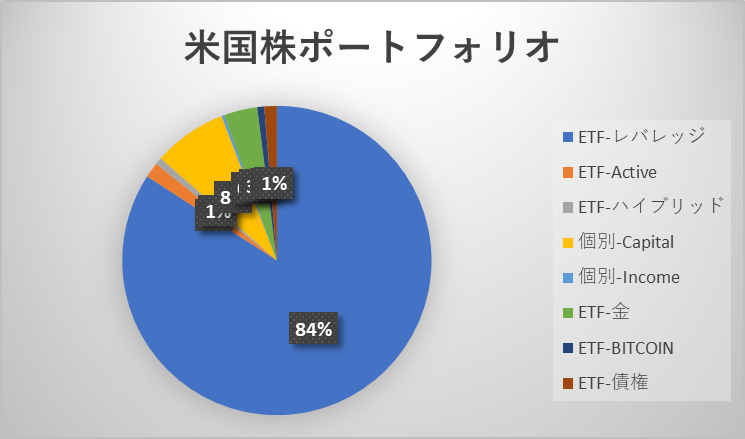 資産のなかの60%が米国株、40%が投資信託です。そして米国株投資の中ではレバレッジETFが84%約半分を占めており、その次に個別-Capitale銘柄が8%と続きます。投資信託は10年以上運用しており、その成長もかなり加速していますが、これは年金運用の一部でもあるので自由に引き出すことが難しく、より柔軟性のある米国株へのシフトを進めて行ってます。今年は投資を続けてきたレバレッジ3倍ナスダックが爆発的に伸びてくれました。26年も米国株は引き続き上下動はありながらも手堅いと考えていますので引き続き期待しています。